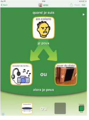 compagnie de l'élève afin de lui rappeler les meilleures mesures à prendre quand il est en colère, anxieux ou contrarié. "Que représente cette image ?" "C'est quand tu es en colère". "Qu'est ce qu'il serait bien de faire quand tu es en colère pour que ça aille mieux ?" " Si on mettait l'image "aller voir Marie-Anne" ?"; "Comme ça quand tu seras en colère, tu penseras qu'il faut aller voir Marie-Anne pour que ça aille mieux "
