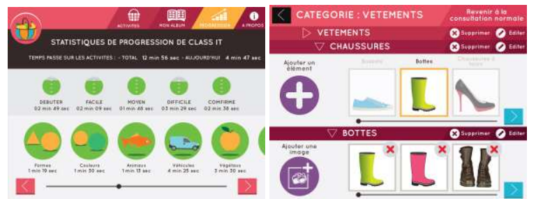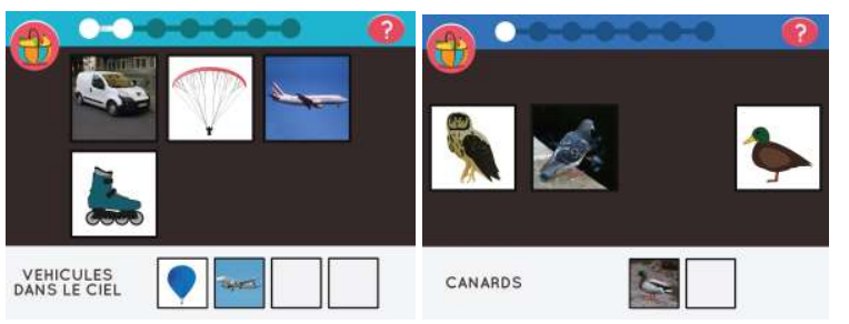 L'application "ClassIt" possède plusieurs niveaux de difficultés pour rentrer progressivement dans la tâche. Ces différents niveaux sont associés à différentes catégories (formes, animaux..) :